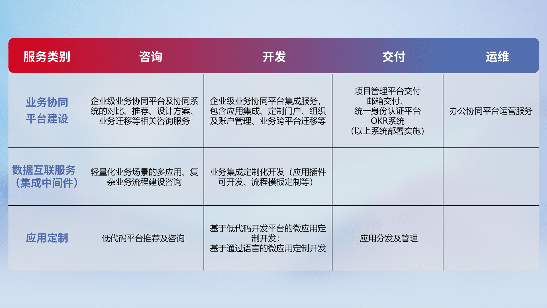 针对钉钉、、、企微、、、IDaas等平台级产品提供产品的规划、、、方案、、交付、、定制化开发等服务,,,,实现如统一协同办公、、智能客户服务、、、混合会议管理、、智能数据查询、、等业务场景,,,实现数字化转型。。。。